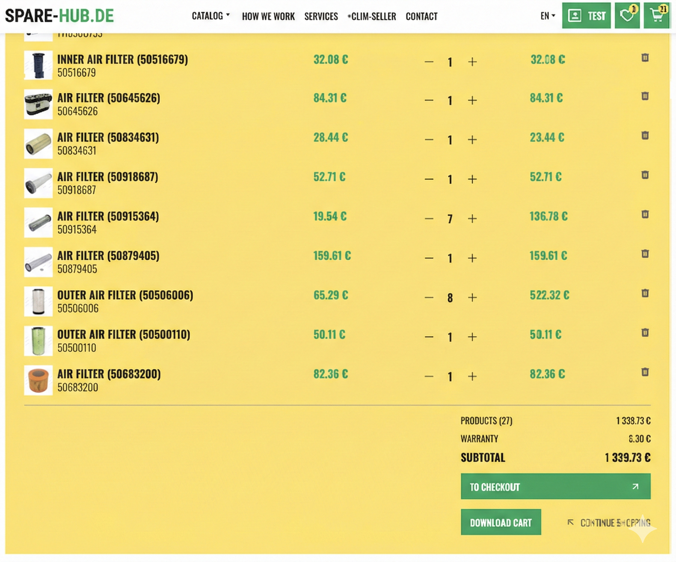 Our system will automatically search the part-numbers from your excel to present the results for the found units with prices directly in your basket list of SPARE-HUB.DE: