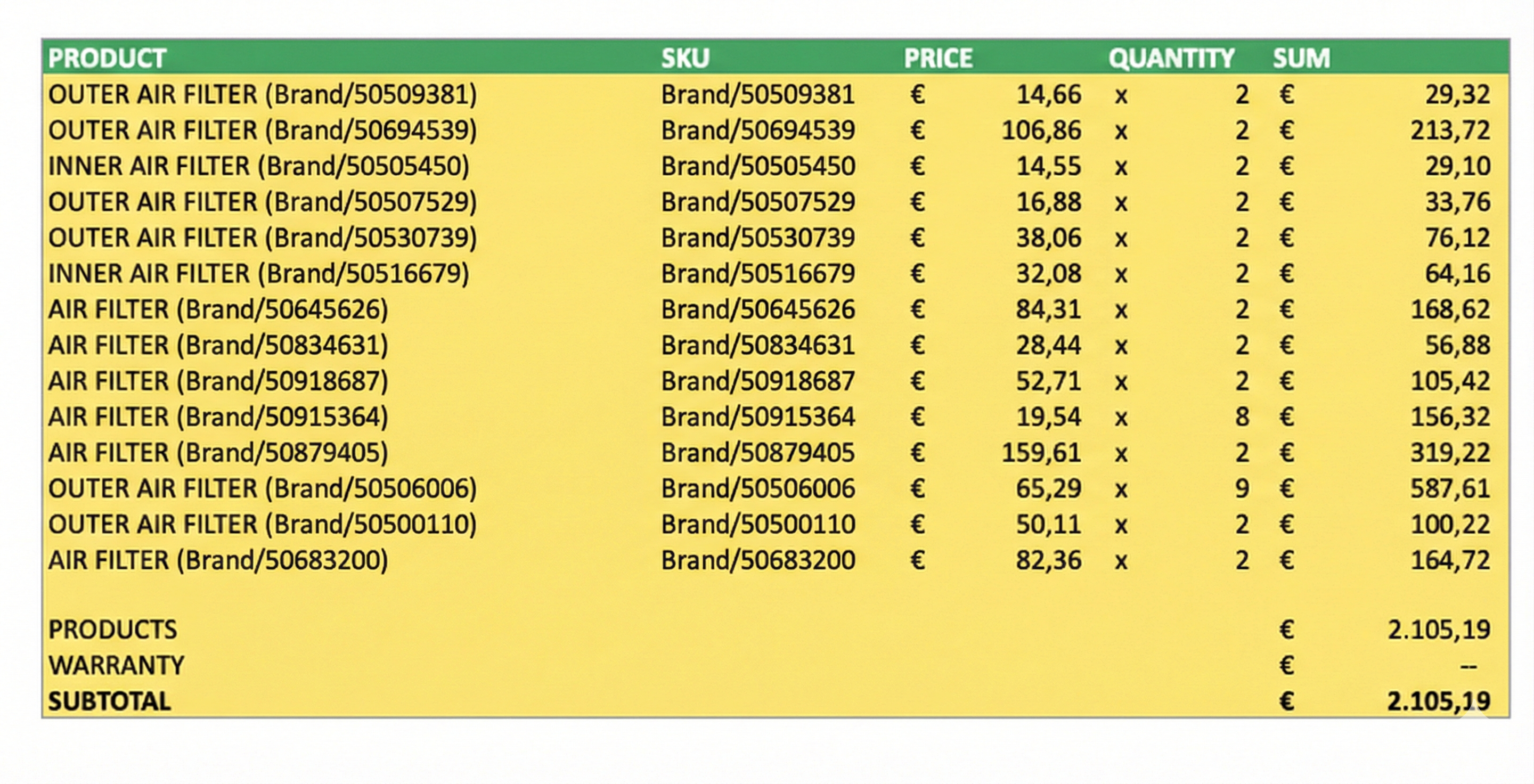 but guess what: already with automatically listed prices from our database into your excel and calculated the total amounts for the selected units for each part-number;).