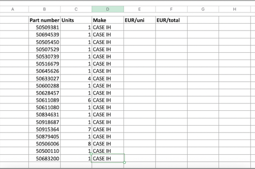 - Prepare your excel-file with the requested part numbers sorted in the template as below